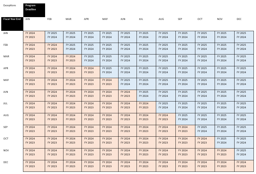 To determine the fiscal years for which you must provide Financial Statements refer to the chart below. Find the date in which your fiscal year ends along the left side and the month in which your program deadline occurs along the top. Examples: